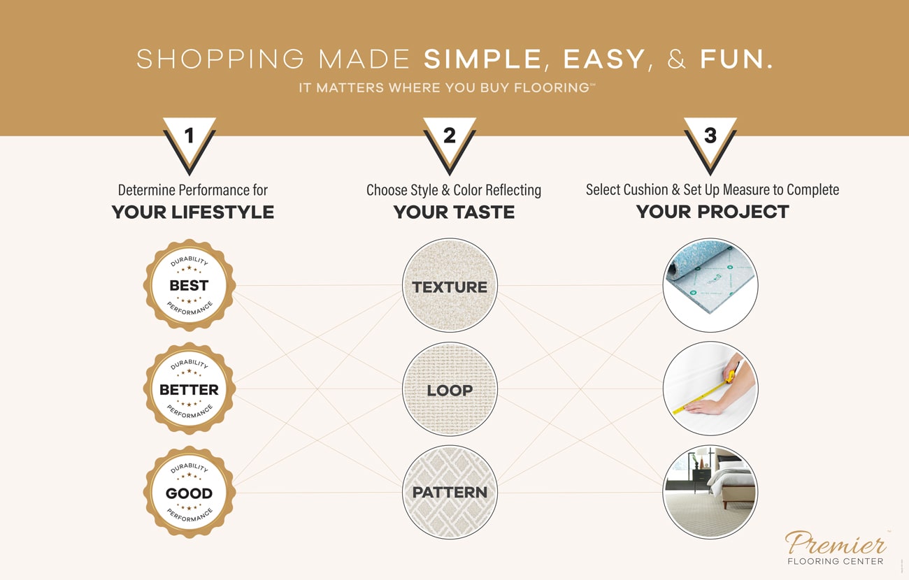 Performance matters. Your lifestyle will determine the type(s) of performance you require from your carpet – durability, cleanability, appearance or all three. This can be a tough decision but rest assured, your Premier Flooring Center retail sales professional will work closely with you to select the BEST carpet to meet your lifestyle needs & budget.